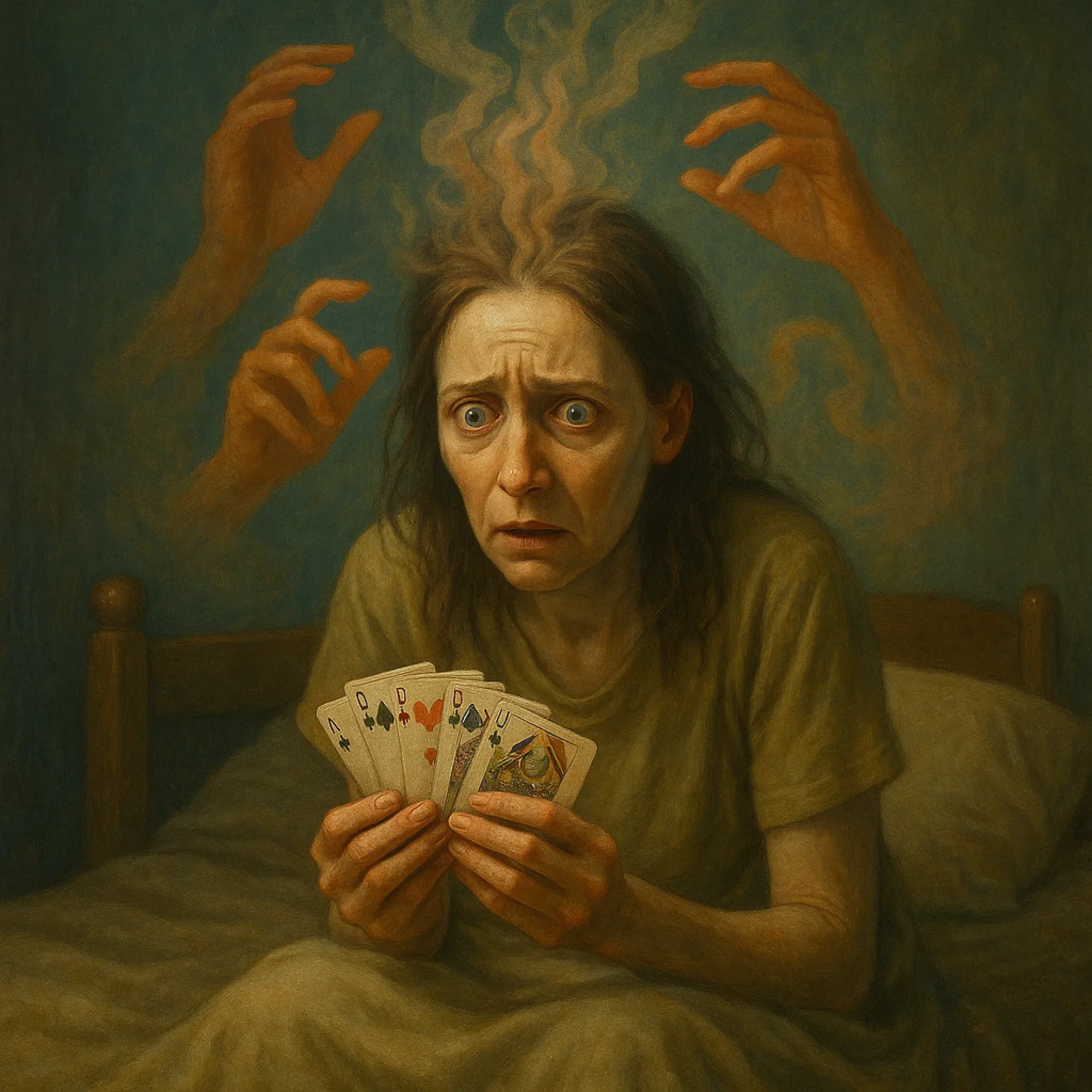 На этот крючок и ловят своих жертв гадания: от тебя ничего не зависит, ты не несёшь ответственности за свою судьбу, потому что она предрешена. Твоя задача сделать выбор для следующего шага, но и здесь тебе помогут, карты никогда не врут. В условиях реальности люди становятся беспомощными детьми, не имеющими возможности двигаться самостоятельно, поэтому испытывают тревогу, снять которую может только предсказание. Лишившись этой возможности в клинике, Анжелика, не в силах справиться с тревогой, пыталась сначала «убежать» от страха в сон, затем выторговать привычную «дозу».